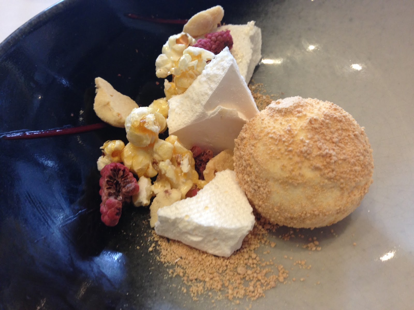 Next up was my dessert - simply titled white chocolate parfait with raspberry and caramel popcorn. It was gorgeous - the parfait was rolled in some kind of crispy coating and alongside it was sweet caramelised popcorn, little meringues, freeze dried raspberries and honeycomb. It was a beautiful looking dish and it tasted fantastic - my favourite one of the meal.